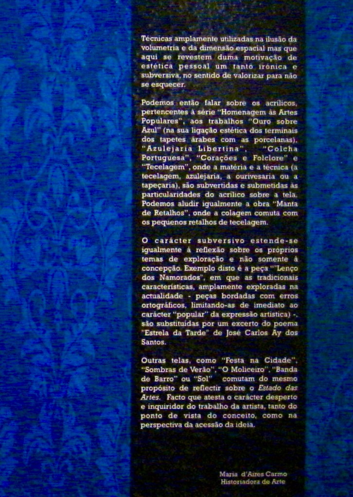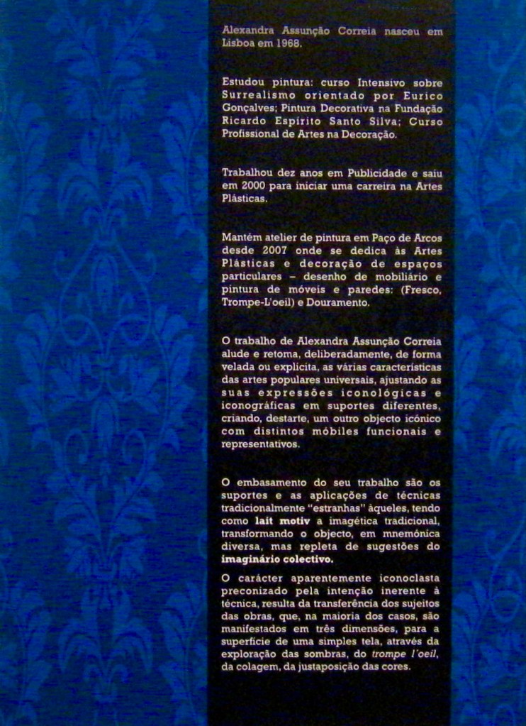 The catalog is a very important physical record for an artist. It establishes a connection between images (paintings, sculptures, photographs, art installations)and a text. An art catalog documents the object images exhibited in a certain place and time. It has an aesthetic purpose and works as a memory for the future. It’s an undeniable proof that a certain exhibition has indeed happened, listing authors, techniques, sizes, dates etc etc. The catalog is also a very important document for the art collector because it legitimates the artwork, whether it will become truly a work of art, only time will tell. The first catalog is a huge personal achievement ! It encapsulates great expectations and emotions. Due to it’s social role, meaning and symbolic value, it’s production must be very well planned and executed, as it testifies an ephemeral exhibition. The same applies to the leaflets, brochures ans posters.