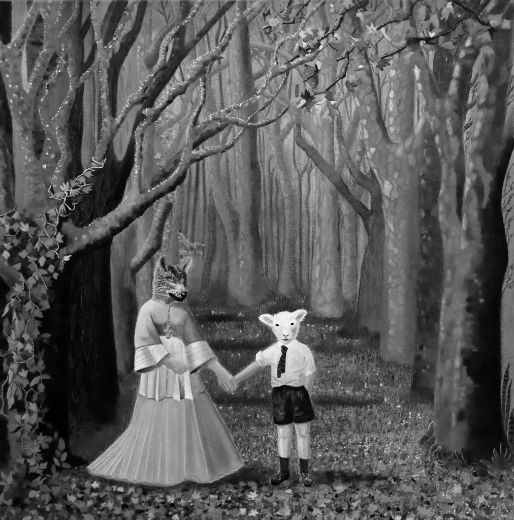 “the wolf and the lamb” acrylic paint on canvas is a very profound reflection about the systemic child sex abuse by many Roman Catholic priests all over the world.