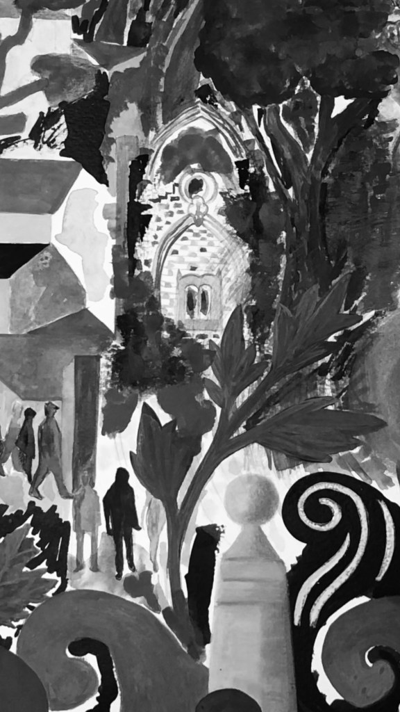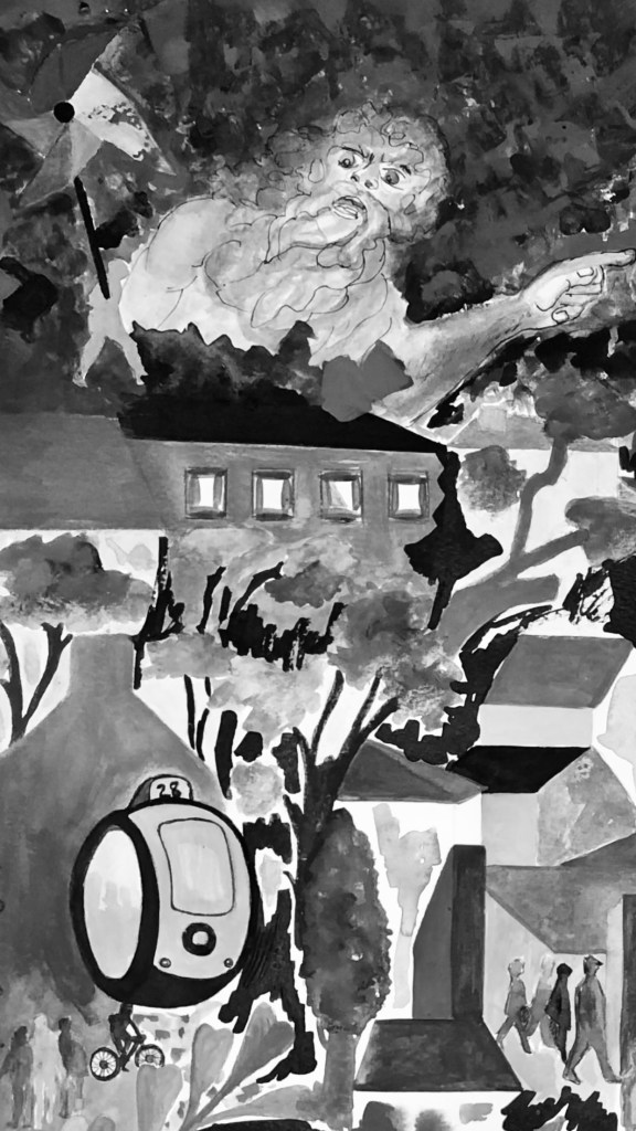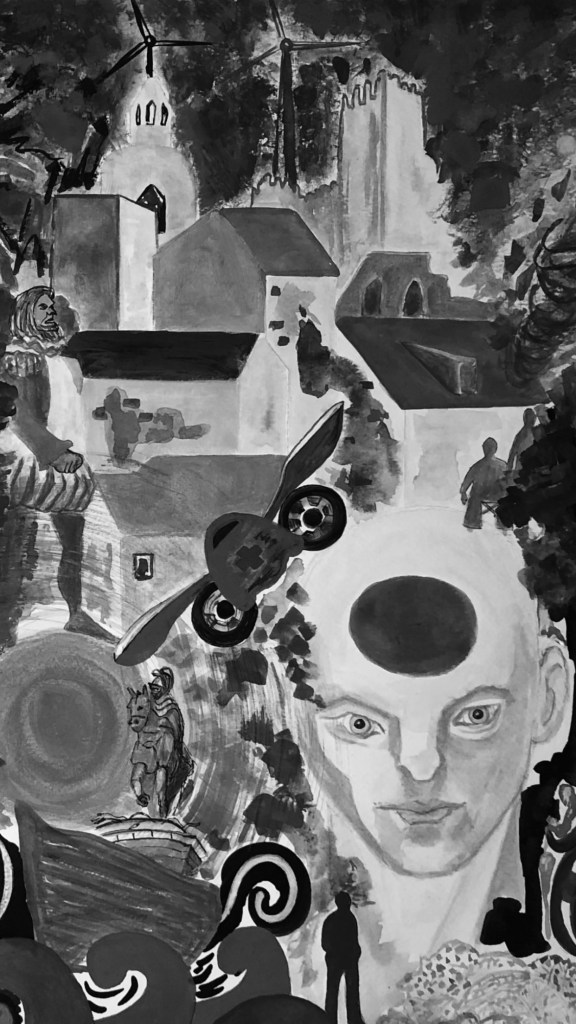 “green cities” acrylic paint over paper is about the naivety and romanticism of “green solutions” when we are confronted with the active wars of this century: Russia-Ukraine, Israel-Palestine, Burkina Faso, Somalia, Sudan, Myanmar, Nigeria, Syria and Yemen, so much destruction, so many lives lost and huge waste of resources, misfortunes that can ruin our life on Earth without having a real opportunity to design an effective plan against climate changes…